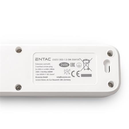 Elosztósor, 3 aljzat, 1,5 m, USB, kapcsolóval, ENTAC, fehér